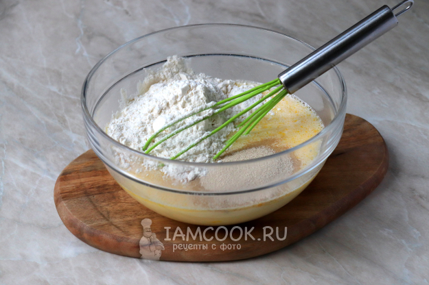 После чего введите просеянную пшеничную муку и добавьте сухие дрожжи.