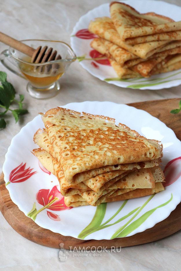Блины на опаре с сухими дрожжами получаются очень вкусными и красивыми. Подавайте их в тёплом виде с мёдом, вареньем или сгущённым молоком.