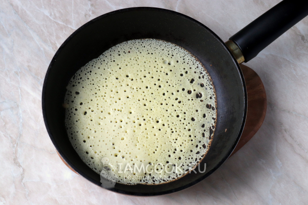 Сковороду смажьте тонким слоем растительного масла (делать это нужно только перед жаркой первого блина, а если ваша сковорода имеет хорошее антипригарное покрытие - можете её и вовсе не обрабатывать) и как следует прогрейте. После чего огонь сделайте ниже среднего и вылейте на сковороду порцию теста, распределив его по всему дну, формируя круглую заготовку.