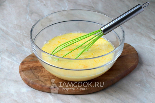 Молоко (400 мл) подогрейте до тёплого состояния (не выше 40 градусов) и вылейте в глубокую миску. Туда же добавьте щепотку соли, куриные яйца, растительное масло и сахарный песок. С помощью венчика тщательно перемешайте до однородного состояния.