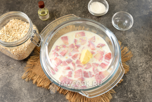 Влейте молоко и ванильную эссенцию, перемешайте содержимое ложкой, сверху положите кусочек сливочного масла хорошего качества. Заливаются хлопья жидкостью в пропорции 1 к 2.
