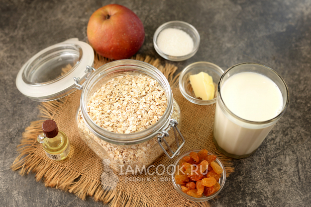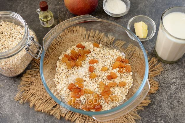 В огнеупорную форму всыпьте овес, добавьте к нему промытый изюм и при желании немножко сахара. Хлопья лучше брать того сорта, который нужно варить, не быстрого приготовления.
