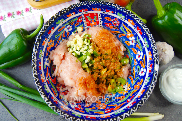 Очистите чеснок и мелко нарежьте, или пропустите через чеснокодавку, выложите в фарш. Приправьте приправой для мяса, посолите и поперчите.