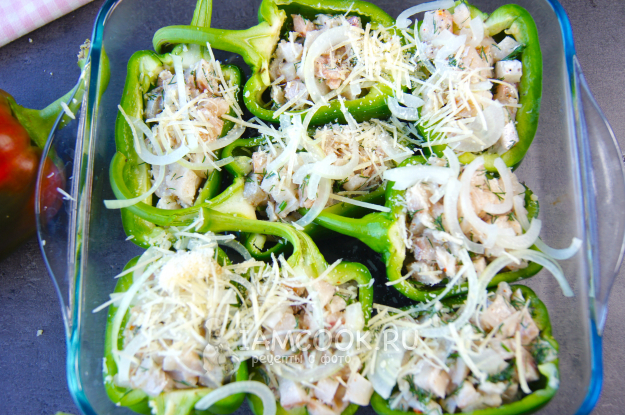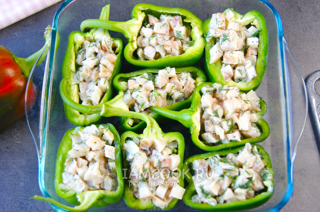 Начините половинки перцев рыбным фаршем, выложите в огнеупорную форму.