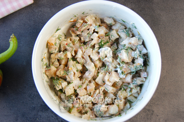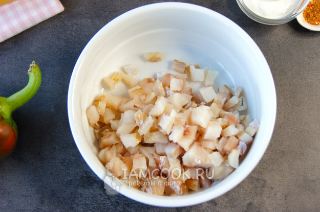 Филе рыбы нарежьте на маленькие кусочки и выложите в миску.