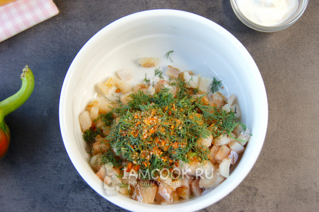 Укроп промойте, мелко нарежьте и выложите в миску к рыбе, добавьте приправу для рыбы, посолите и поперчите.