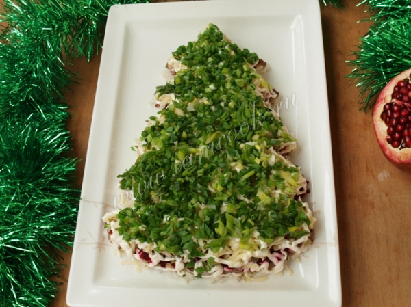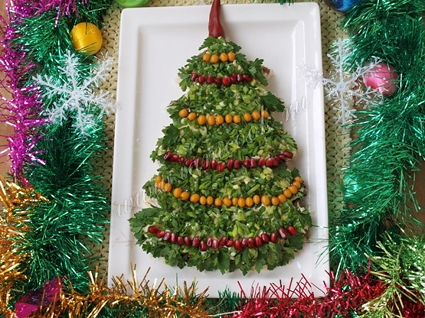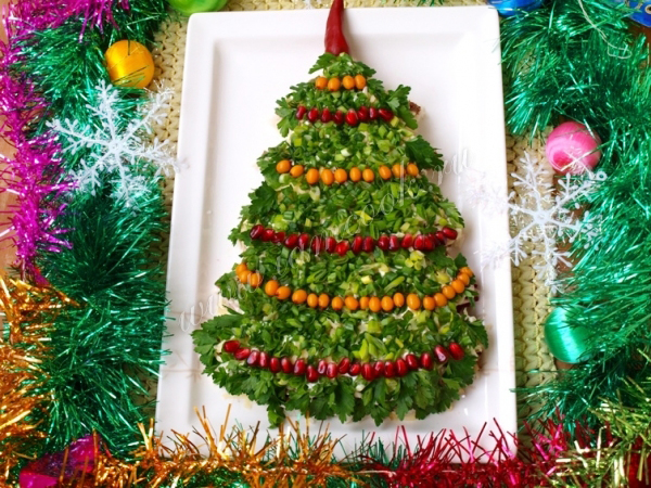 Уже в процессе увидела что пучка зелёного лука будет недостаточно,поэтому добавила петрушку, так даже интересней получилось. Из гранатовых зёрен делаем бусы на ёлке. Для контраста решила добавить ягоды облепихи, а для верхушки использовала маринованный перец. Вот такой салат получился.