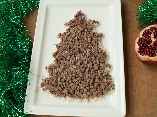 Горядину нарезать кубиками и выложить сверху риса, затем также покрыть майонезом.