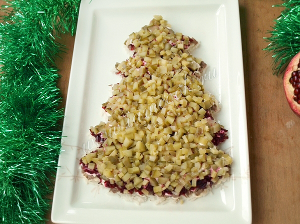 Нарезать кубиками маринованные огурцы,выложить их сверху свеклы.