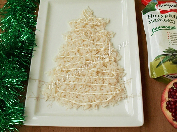 На блюдо выложить варёный рис в форме ёлки,сделать майонезную сеточку.