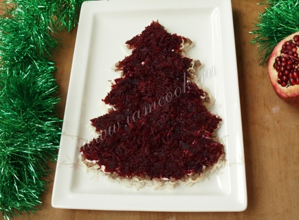 Свеклу натереть на тёрке и выложить сверху мяса. Снова нанести майонезную сетку.