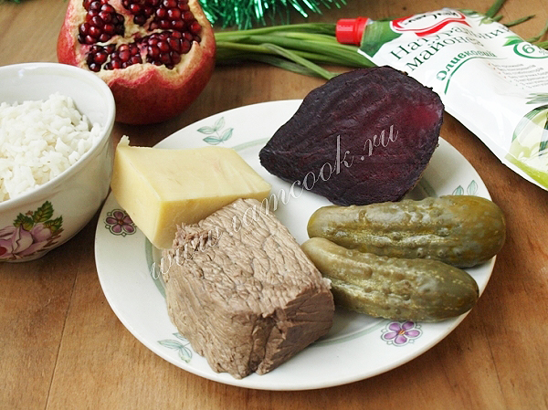 Для приготовления салата "Ёлка" я решила использовать такие продукты: говядину, рис, свеклу, маринованные огурцы, сыр моцарелла, зелёный лук, майонез и гранат для украшения. Рис предварительно сварить в подсоленной воде, а свеклу лучше запечь в духовке в фольге.