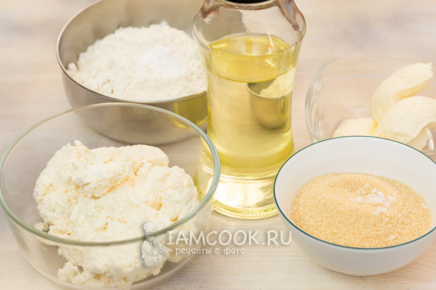 Для приготовления творожного теста без яиц на подсолнечном масле подготовьте продукты по списку.