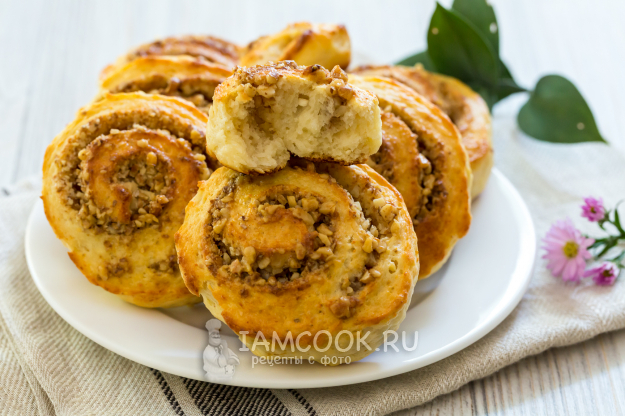 Вот такие булочки-рулетики я испекла из данного теста. Начинка - грецкие орехи и сахар.