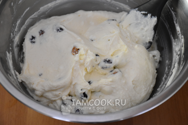 Добавить сухофрукты и еще раз хорошо перемешать, чтобы кусочки равномерно распределились в тесте.