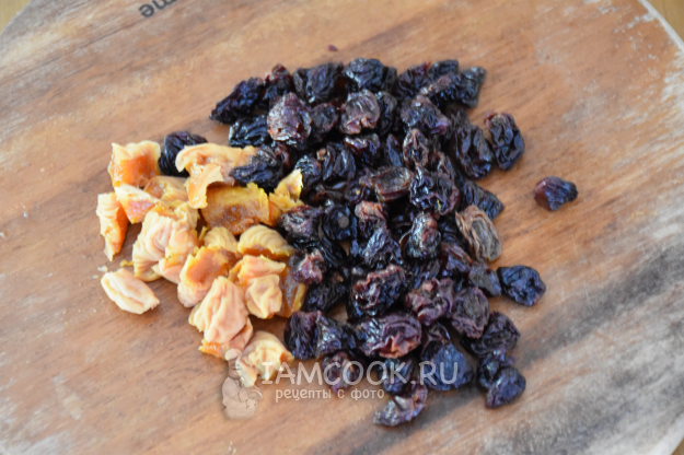 Сухофрукты промыть, залить горячей водой и оставить на 10 минут. Нарезать кусочками.