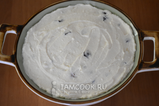 Выложить творожную массу в форму диаметром 18 см и разровнять. Выпекать творожную запеканку с рисовой мукой в духовке, разогретой до 200 градусов С, 40 минут.