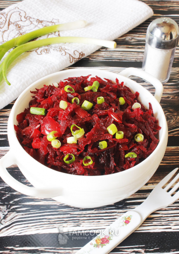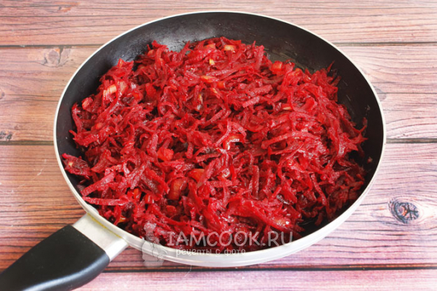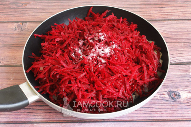 Все хорошо перемешиваем, накрываем сковороду крышкой и тушим свеклу 15 минут на медленном огне при нечастом помешивании, чтобы она не пригорела. За 5 минут до готовности пробуем блюдо на вкус: если свекла несладкая, то можно добавить немного сахара по вкусу, но это по желанию.