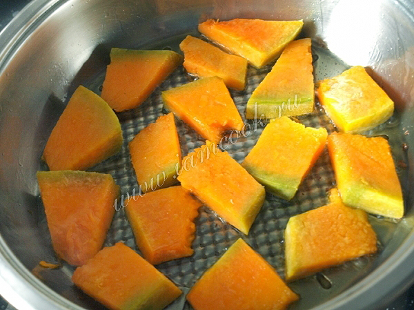 В сковороде разогреть масло и обжарить кусочки тыквы почти до готовности.