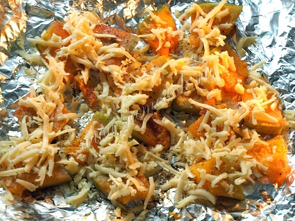 Переложить тыкву на фольгу или в огнеупорную форму, засыпать щедро натёртым твёрдым сыром и поставить в разогретую духовку.