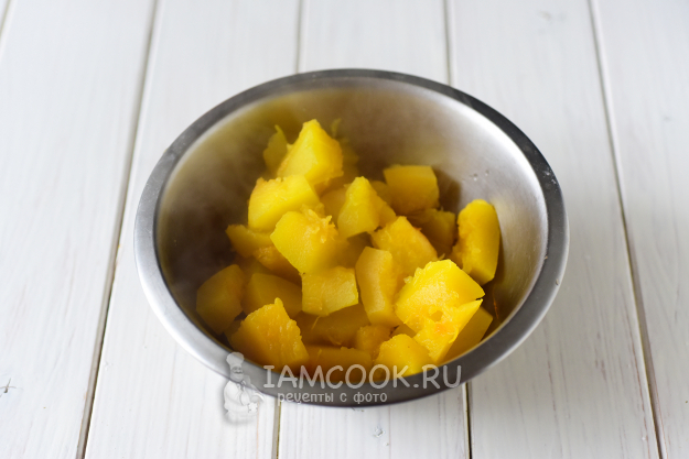 Отваренные кусочки тыквы выложить в миску, слив излишнюю жидкость.
