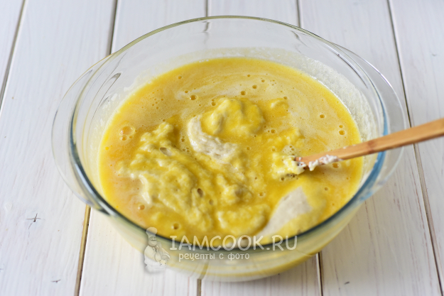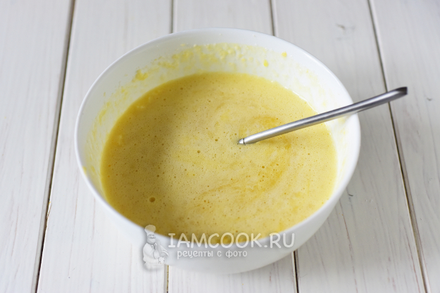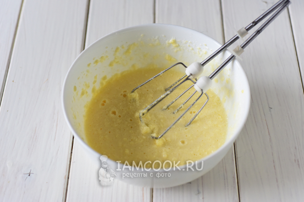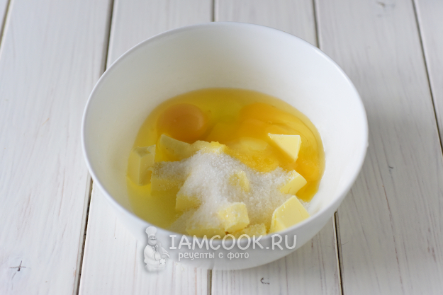 В отдельную миску выложить мягкое масло, оставшийся сахар и вбить яйца.