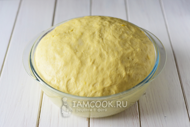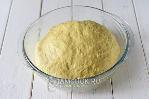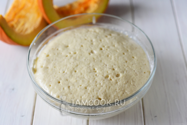Через час тесто очень увеличилось в размере. Оно имеет нежный желтоватый оттенок из-за добавления тыквенного пюре.
