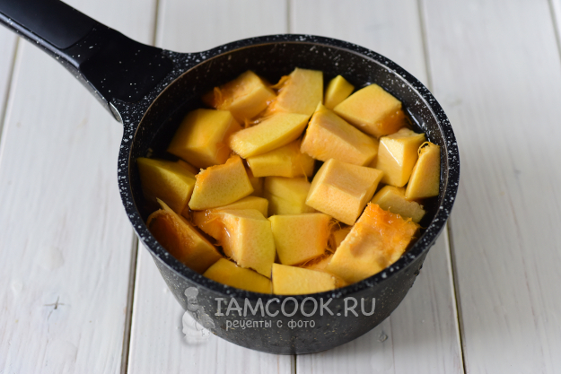 Параллельно займемся тыквенным пюре. В сотейник выложить тыкву, порезанную кусочками для удобства, залить водой и поставить на средний огонь. Варить до мягкости - я варила 10 минут с момента закипания жидкости.