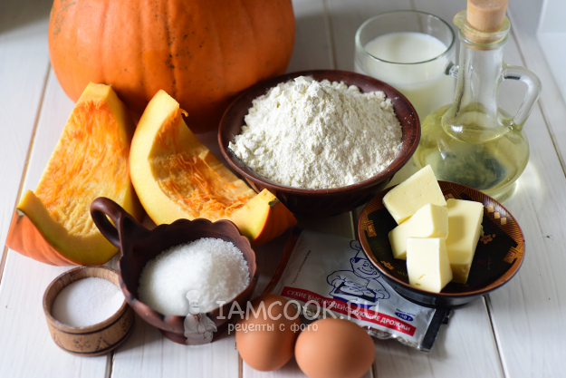 Подготовить продукты для тыквенных пончиков. Кусочки тыквы освободить от кожуры и семян и взвесить необходимое количество. Масло должно быть мягким, поэтому желательно заранее его выложить из холодильника на стол. Молоко должно быть теплым (35-37 градусов), можно чуть подогреть его на плите.