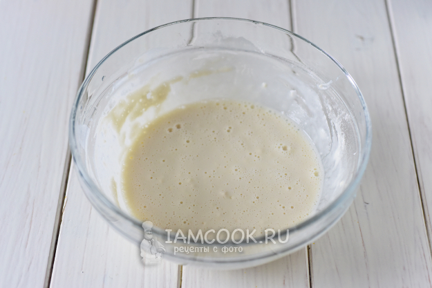 Займемся опарой для теста. В миску залить теплое молоко, добавить дрожжи, засыпать одну столовую ложку сахара и четыре столовых ложки муки. Ингредиенты перемешать до получения однородной смеси и отставить миску с опарой в теплое место на 20 минут созревать.