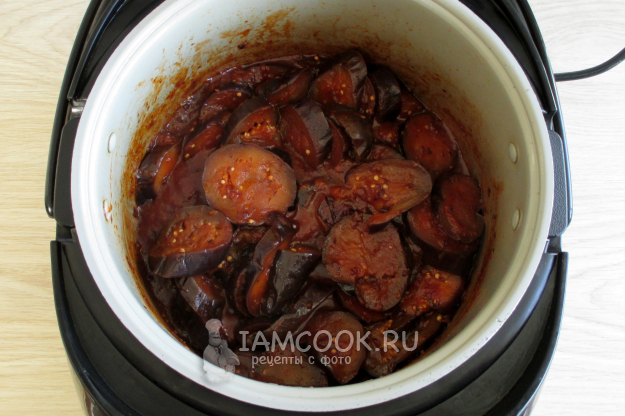 Тушите при периодическом помешивании около получаса (до мягкости баклажанов!). В мультиварках это режим "Тушение", на плите - средний огонь. В конце приготовления влейте уксус и перемешайте. Уксус тут не только и не столько для консервирования, но и для вкуса. Но если баклажаны готовятся для подачи сразу же, а не для заготовки, то добавление яблочного уксуса - на ваше усмотрение.