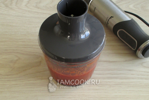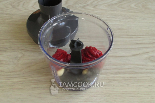 Для соуса измельчите при помощи блендера чернослив с зубчиками чеснока и перемешайте с томатной пастой.