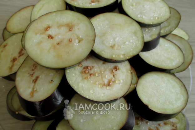 Баклажаны нарежьте, например, кружочками: толстые плоды - поперек, тонкие - наискосок. Толщиной 7-10 мм. Посыпьте их солью (на это количество истратилось примерно 1,5 ст.л. соли). Оставьте на полчаса - это делается, чтобы удалить горечь. Знаю, что иногда такой шаг подготовки и пропускают, но это зависит вроде от сорта баклажанов. Я не рискую...