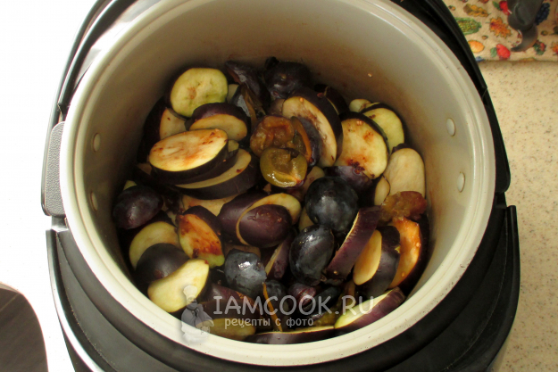 Доведите до кипения при помешивании, чтобы не пригорело. Например, в мультиварках подойдет режим "Тушение" или другой подобный на ваше усмотрение, в зависимости от модели имеющейся мультиварки, а на плите - сильный огонь. Отправьте в этот соус подготовленные баклажаны и сливы.