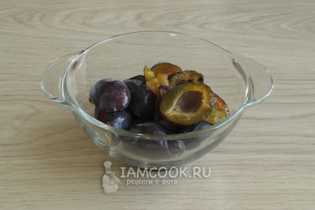Свежие сливы разрежьте на половинки и удалите косточки.