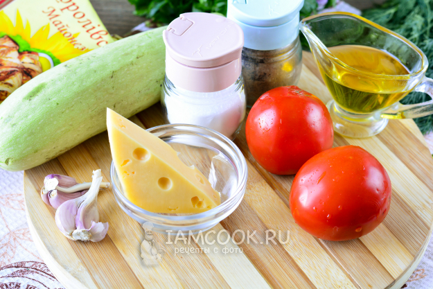 Возьмите ингредиенты для приготовления кабачков по-французски в духовке.