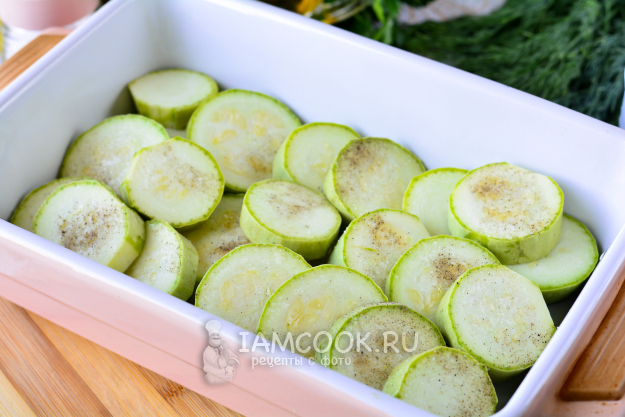 Форму для запекания смажьте маслом, выложите кабачки - можете укладывать овощи немного внахлест друг на друга.