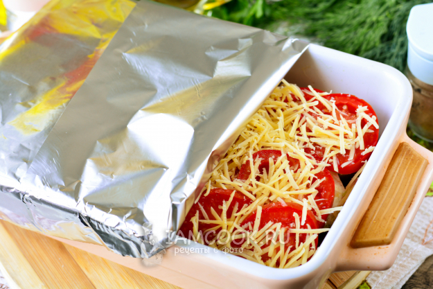 Форму прикройте фольгой и поставьте запекаться в духовку.