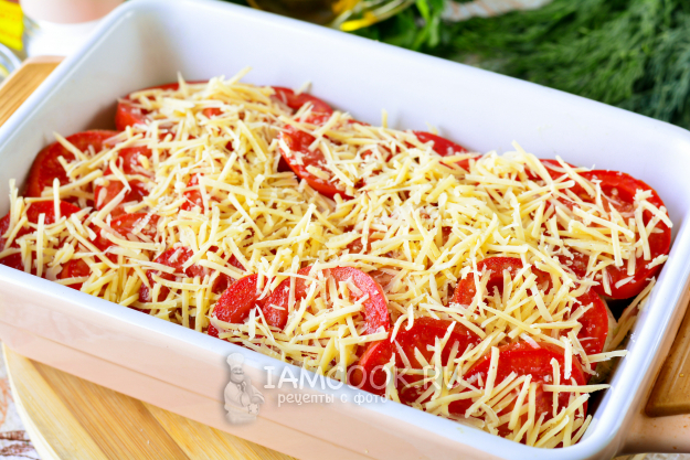 Присыпьте блюдо натертым сыром. Сыр берите по вкусу, любого вида - российский, голландский или более пикантный - радомер либо маасдам.