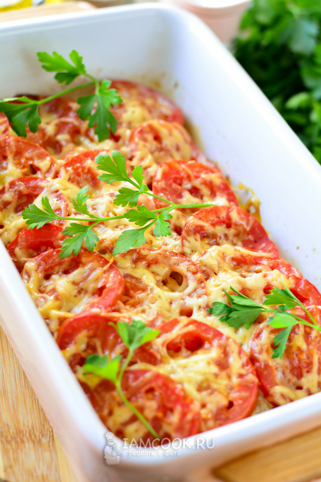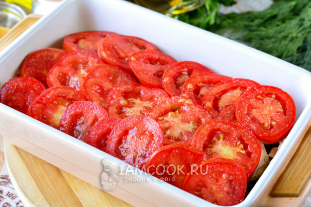 Сверху на кабачки распределите помидоры, нарезанные тонкими колечками. Помидоры чуть посолите и поперчите.