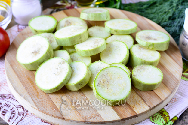 Кабачки посолите и поперчите, специи сделают их вкуснее. Также можете использовать и другие приправы, например прованские травы.