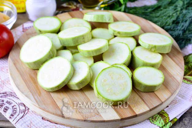 Промойте кабачки, срежьте хвостики с двух сторон. Кабачки берите молодые - они нежные и без крупных семян. Нарежьте кабачки средними кружочками.