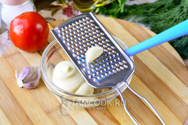 Майонез смешайте с натертым на мелкой терке чесноком. При желании можете выдавить через пресс.
