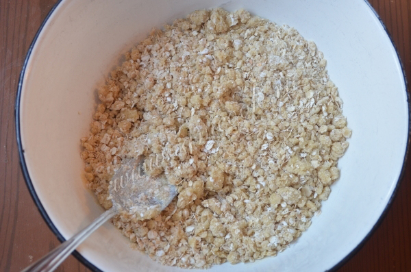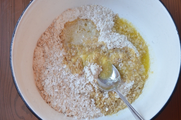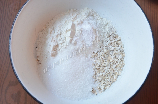 Смешать в миске сухие ингредиенты: муку, овсяные хлопья, сахар, соль, разрыхлитель.
