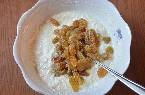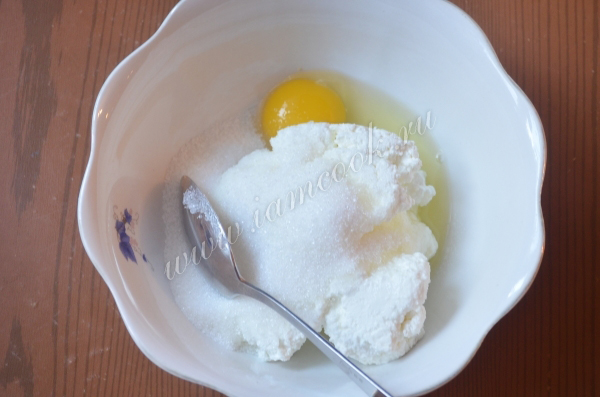 Творог перемешать с яйцом, сахаром, ванильным сахаром в однородную массу.