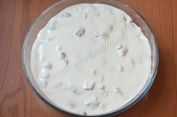Форму для выпечки смазать растительным маслом, выложить 2/3 теста.