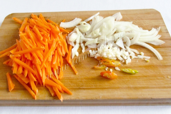 Морковь, лук, чеснок и острый перчик нарезать.