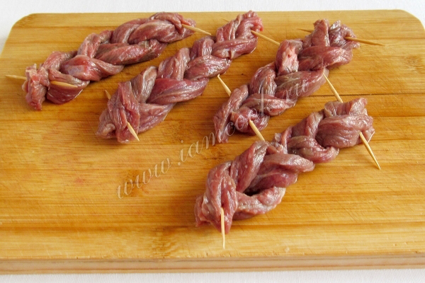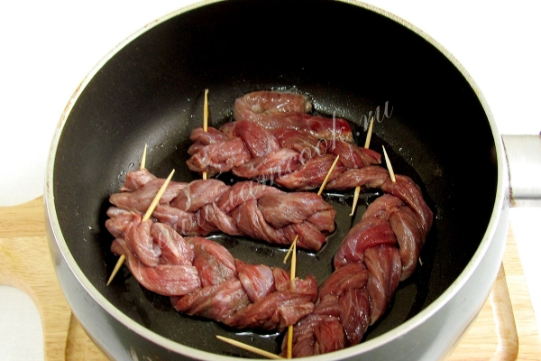 Говядину нарезать на тонкие и длинные полоски. Переплести в виде косичек, скрепить зубочистками края.