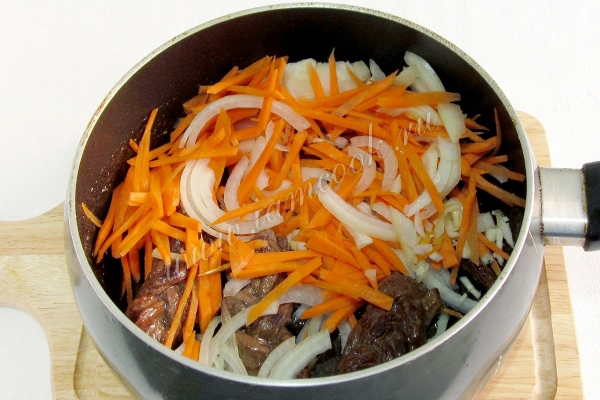 Затем добавить к мясу нарезанные овощи. Поджарить в течение 7 минут, чтобы запахи могли смешаться.