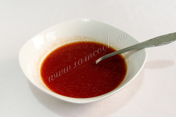 Тем временем разбавить кипяченой водой томатную пасту, подсолить и добавить  полторы чайных ложки сахара.